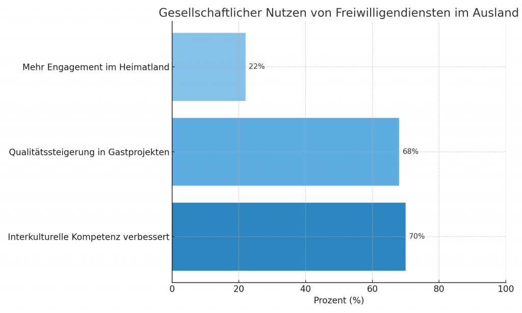 Auch die Herkunftsländer profitieren. Junge Menschen, die Auslandserfahrungen im Rahmen eines Freiwilligendienstes sammeln, kehren mit erweiterten Kompetenzen zurück. Interkulturelle Sensibilität, Sprachkenntnisse, Problemlösungsfähigkeiten und ein ausgeprägtes Verantwortungsbewusstsein sind nur einige der erworbenen Fähigkeiten. Eine Umfrage des Deutschen Zentrums für Hochschul- und Wissenschaftsforschung (DZHW) aus dem Jahr 2022 ergab, dass 74 % der Rückkehrer ihr Engagement in zivilgesellschaftlichen Organisationen nach ihrer Rückkehr verstärken. Eine Gesellschaft, in der Auslandserfahrungen verbreitet sind, wird dadurch offener, innovativer und widerstandsfähiger gegenüber globalen Herausforderungen.